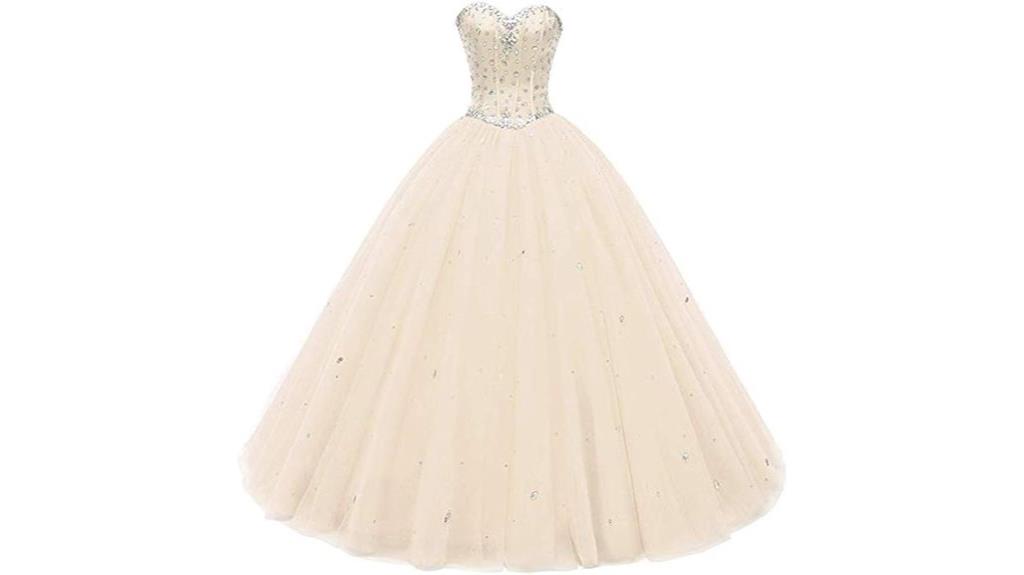 The Womens Sweetheart Ball Gown Tulle Quinceanera Dresses Prom Dress stands out as an excellent choice for those seeking an elegant, versatile gown suitable for a variety of special occasions. Its high-quality feel and beautiful design exceed expectations, with soft fabrics, sewn-on gems, and a luxurious appearance enhanced by a petticoat. The adjustable corset-style top provides a comfortable fit for different body types, and the dress’s swishy skirt offers a princess-like silhouette. Available in vibrant colors like burgundy and champagne, it’s perfect for quinceañeras, prom, or costume events. Despite minor details like glued gems, its affordability and stunning look make it a popular pick.