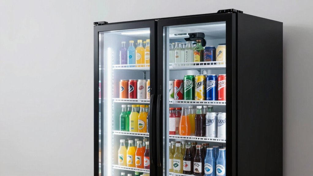 When it comes to maintaining the perfect temperature for your beverages, the cooling technology inside a refrigerator with a glass door makes all the difference. Advanced air circulation, like 360° circulating airflow, guarantees even temperature distribution, preventing hot or cold spots. High-tightness door seals and low-e coated tempered glass keep cold air inside, maintaining consistent temperatures. Digital thermostatic controls allow precise adjustments within a range of 32°F to 64°F, with 1°F accuracy, making temperature management straightforward. Compressor-based cooling systems provide rapid cooling and stable temperature maintenance, ensuring your drinks are always at the perfect chill. Additionally, efficient cooling technology helps minimize noise, often below 36dB, so your fridge runs quietly without disrupting your environment.