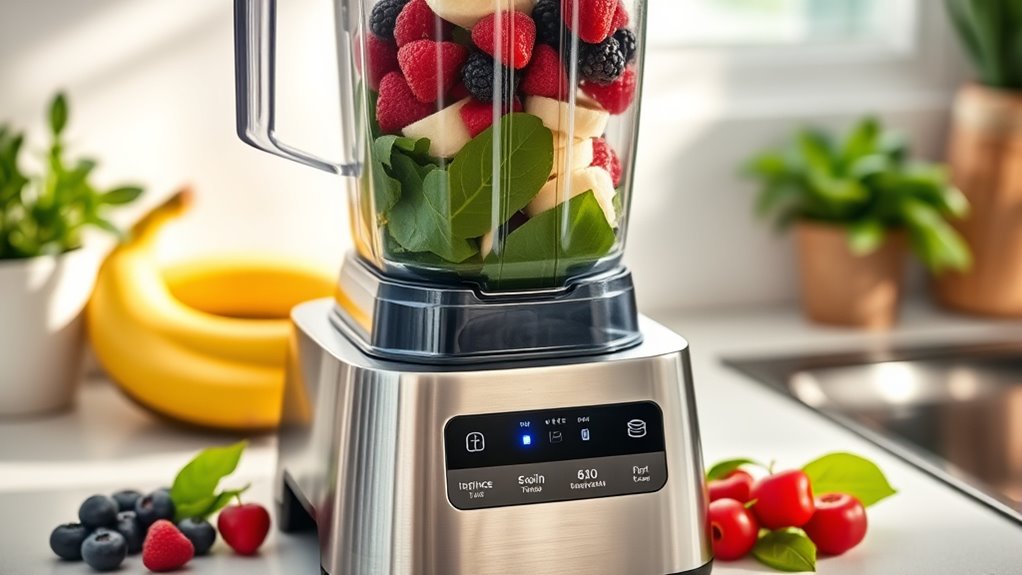 A key factor in choosing the right blender for smoothies is its power and speed. Higher wattage motors, like 1200W or more, make blending tough ingredients such as ice and frozen fruits much easier and faster. Variable speed control allows me to fine-tune the blending process, ensuring a smooth, consistent texture every time. Rapid speeds, reaching up to 25,000-32,000 RPM, help break down cell walls of fruits and vegetables, maximizing nutrient extraction. Power also determines how versatile the blender is; stronger motors can handle nuts, grains, and ice, expanding your smoothie options. Plus, a more powerful motor cuts down on blending time, saving you effort and ensuring a lump-free, silky result. Power and speed are essential for a smooth, efficient blending experience.