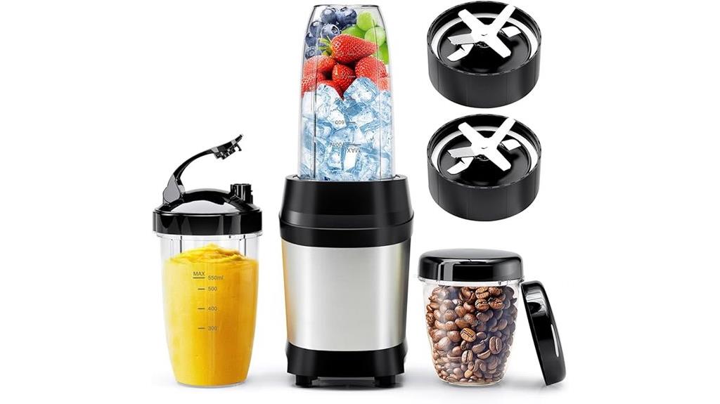 High-quality blender blades are essential for achieving smooth, consistent results, and stainless steel is the standard material because of its durability, corrosion resistance, and sharpness. The design of the blades also matters—multiple blades or elongated, sharp-edged ones improve their ability to crush ice, fibrous ingredients, and tough produce thoroughly. The number and arrangement of blades influence blending performance; six or more blades promote better circulation and finer textures. Removable, dishwasher-safe blades make cleaning easier and help maintain their sharpness and hygiene over time. Additionally, blade angles and cutting edges are engineered to create cyclonic or vortex flows, which boost ingredient circulation and blending speed. Together, these factors *guarantee* your smoothies are consistently smooth and well-blended.