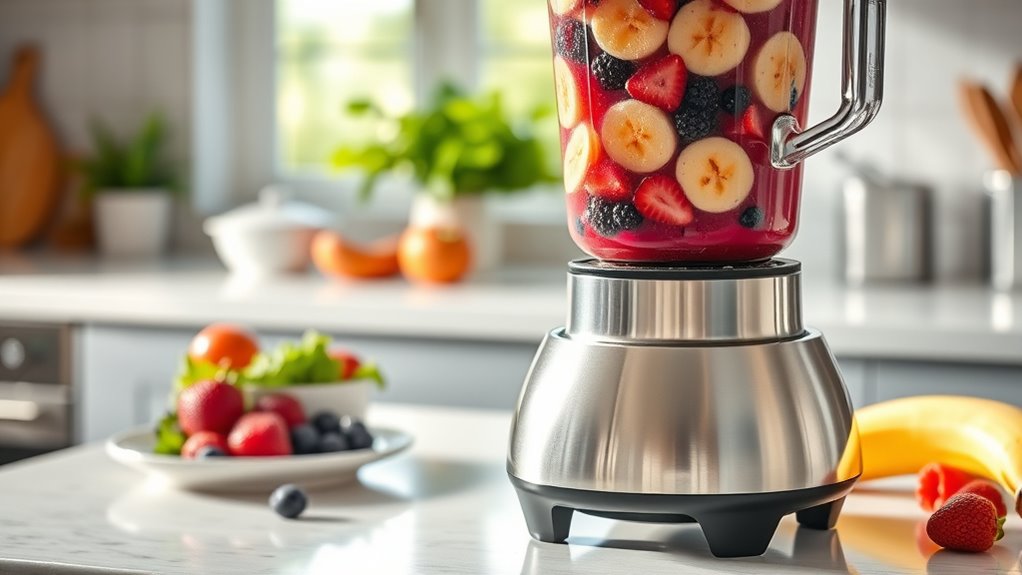 Have you ever been startled by a loud blender noise or felt vibrations that make it wobble on your countertop? If so, you’ll want a model with lower noise levels—ideally below 80 decibels—for a quieter experience. Vibration can also be an issue, especially with powerful motors; it can cause instability or even move your blender around. Look for blenders with anti-slip bases or stable designs to prevent this. Some models come with soundproof shields that cut noise by 20-30 dB, making blending much more peaceful. Features like soft-start technology and balanced blades help reduce vibrations, resulting in smoother, quieter operation. Prioritizing noise and vibration factors can make your smoothie prep more enjoyable and less disruptive.