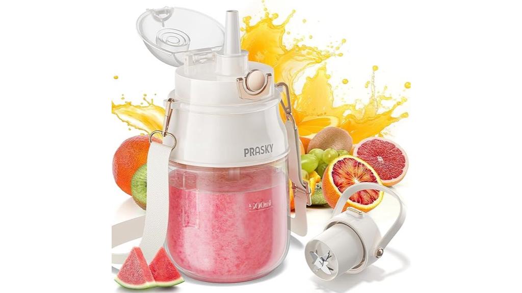 For anyone seeking a portable blender that combines convenience with performance, the Prasky Personal Blender stands out. Its lightweight design and 27oz BPA-free cup make it perfect for smoothies, shakes, or light blending on the go. Powered by a 70W motor and a 1500mAh rechargeable battery, it crushes ice, nuts, and fruits quickly within 60 seconds. With USB-C charging, you can easily power it from your laptop or power bank. Safety features like an intelligent lock prevent accidents, while the dishwasher-safe cup and rinseable blades simplify cleaning. Its compact, stylish look and portability make it a top choice for busy lifestyles and outdoor adventures.