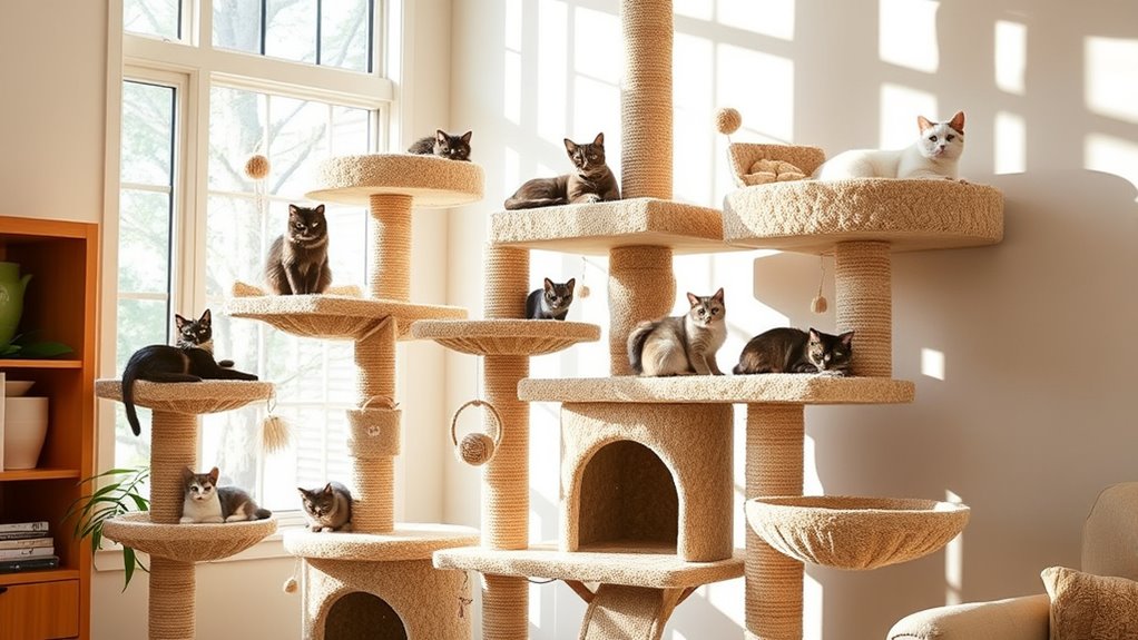 Imagine your cat lounging atop one of these trees, sunlight catching their fur as they purr contentedly. Just like finding the perfect spot in a sunbeam, choosing the right cat tree can transform your space into a feline paradise. With options from cozy condos to towering adventures, you’ll create a cozy haven where your kitty can play, scratch, and relax. After all, a happy cat makes for a happier home—what more could you want?