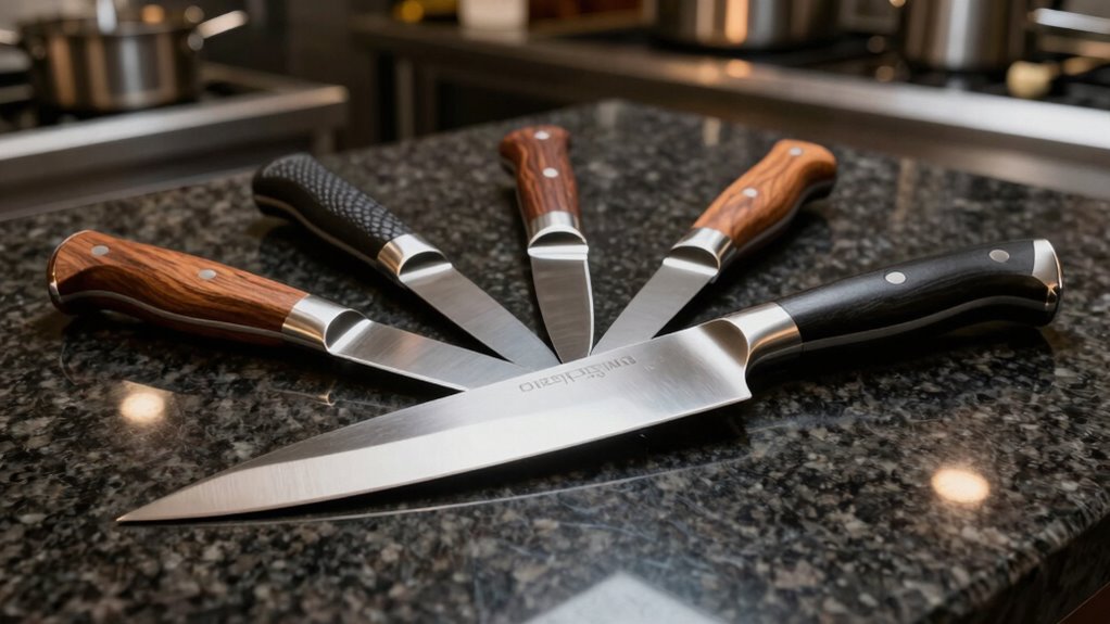 An ergonomic handle design guarantees that a chef knife feels comfortable and secure in your hand, which is essential during long hours in the kitchen. A well-fitting handle minimizes fatigue and allows for precise control. Handles with textured or finger-pointed surfaces ensure a non-slip grip, even when wet, boosting safety. Full tang construction with riveted handles enhances balance, stability, and durability, making the knife reliable for professional use. Materials like pakkawood or Micarta offer comfort and resist moisture and wear, maintaining their quality over time. Proper handle shapes, such as a sloped bolster or octagonal design, improve grip stability and reduce wrist strain. Prioritizing handle ergonomics ensures comfort, control, and efficiency during intensive prep work.