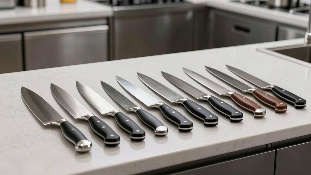 A sharp, well-maintained blade is the cornerstone of any effective chef knife, and its quality can make a significant difference in your kitchen performance. Look for blades with a hardness rating of 56-58 HRC, which helps the edge stay sharp longer. The edge angle, usually around 15°, affects cutting precision; a lower angle results in a sharper, more delicate edge. Hand-sharpened blades with polished edges tend to cut more smoothly and retain their sharpness better than machine-ground counterparts. Material composition also matters—high-carbon stainless steel balances sharpness with resistance to dulling. Regular honing and proper maintenance are essential to keep the edge in top shape, ensuring your knife continues to perform efficiently during meal prep.