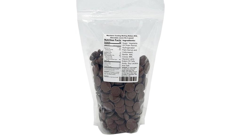 For professional bakers and home enthusiasts seeking reliable, easy-to-melt chocolate coatings, the Merckens Coating Melting Wafers Milk Chocolate Cocoa Lite in a 2-pound bag stands out as a versatile choice. These wafers are perfect for enrobing, dipping, molding, and decorating a variety of baked goods and confections. They melt smoothly without the need for tempering and resist blooming, ensuring a glossy finish every time. The large 2-pound package makes them ideal for big batches or multiple uses. Overall, they’re user-friendly, consistent, and dependable—making them a go-to option for anyone looking to add that perfect chocolate touch.