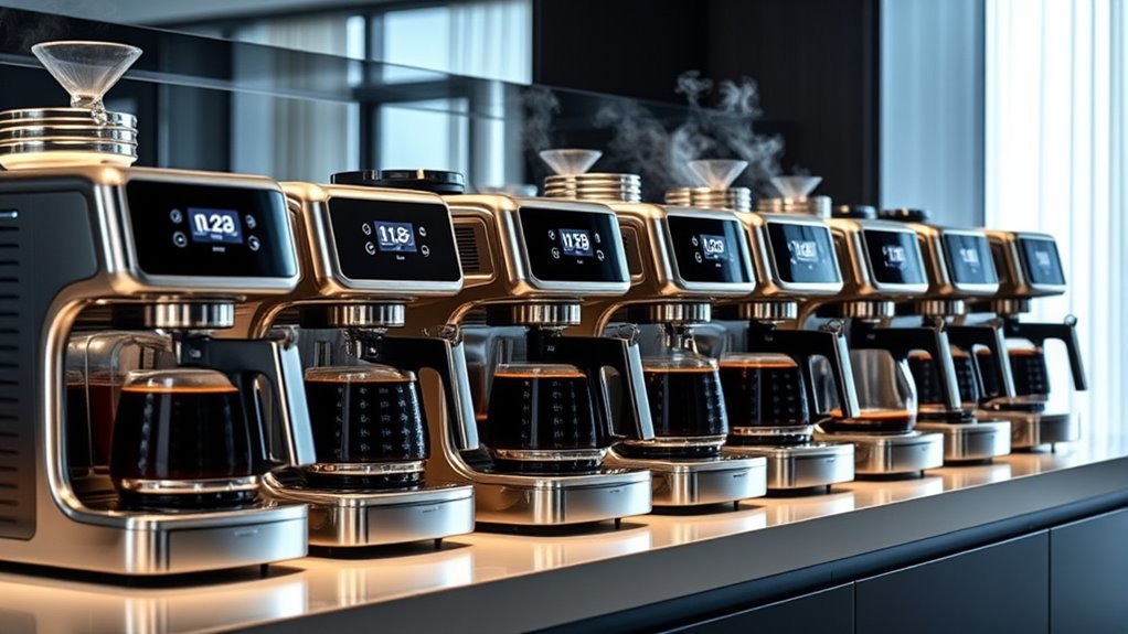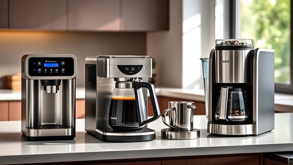 If you’re looking for the 15 best coffee makers of 2025 that brew perfect cups every time, I’ve got you covered. From versatile machines supporting capsules and ground coffee to compact options ideal for small spaces, these models offer quick brewing, customizable strengths, and reliable performance. Whether you prefer espresso, single serve, or large carafe options, there’s something for everyone. Keep going to discover more details about each top choice and find your perfect coffee companion.