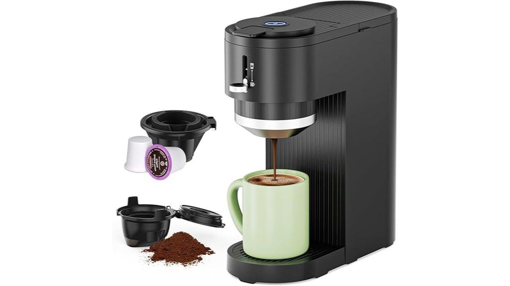 For those seeking versatility and convenience in a compact design, the Single Serve Coffee Maker compatible with capsules and ground coffee stands out as an excellent choice. I appreciate how it supports both brewing styles, offering five adjustable brew sizes for personalized cups. Its lightweight, space-saving design makes it perfect for small kitchens, offices, or outdoor use. With one-touch operation and quick brewing—around three minutes—I can enjoy my favorite coffee swiftly. The reusable filter adds convenience, and safety features like automatic shutoff ensure worry-free brewing. Overall, it’s a versatile, user-friendly machine that delivers on convenience and performance every time.
