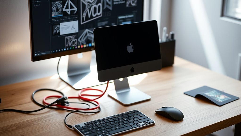 To get the most out of a compact workstation Mac, you need a display that meets high standards for color accuracy and clarity. A true 10-bit display supporting P3 wide color and HDR guarantees vibrant, precise colors, essential for tasks like color grading and detailed design work. High resolution and brightness levels of 1000 nits or more allow accurate HDR content previewing, capturing every nuance. Contrast ratios of at least 1,000,000:1 provide deep blacks and bright highlights, crucial for professional visual editing. Additionally, features like ProMotion technology with a 120Hz refresh rate deliver smooth visuals and reduced motion blur, enhancing performance during demanding tasks. Prioritizing these standards helps ensure your workflow remains accurate and visually stunning.
