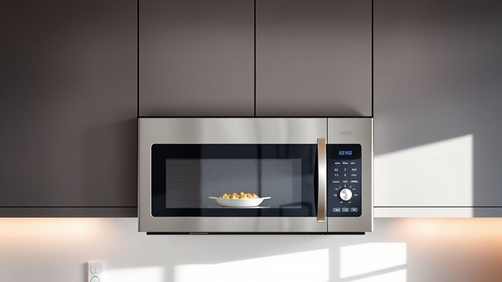 Good ventilation is essential when choosing a convection microwave over the range because it directly affects air quality and kitchen comfort. I look for models with adjustable fan speeds, usually between two and four, to customize airflow for different cooking needs. Airflow capacities of 300 to 400 CFM ensure efficient removal of odors and smoke. Ventilation options can be ducted, venting outside, or recirculating through charcoal filters, affecting installation and air quality. Larger vents or multi-speed exhaust systems improve airflow and reduce fumes more effectively. Some models feature automatic venting or sensor-based controls that activate based on steam or smoke levels, ensuring excellent air circulation. Proper ventilation design minimizes noise and maintains a comfortable environment during extended cooking sessions.