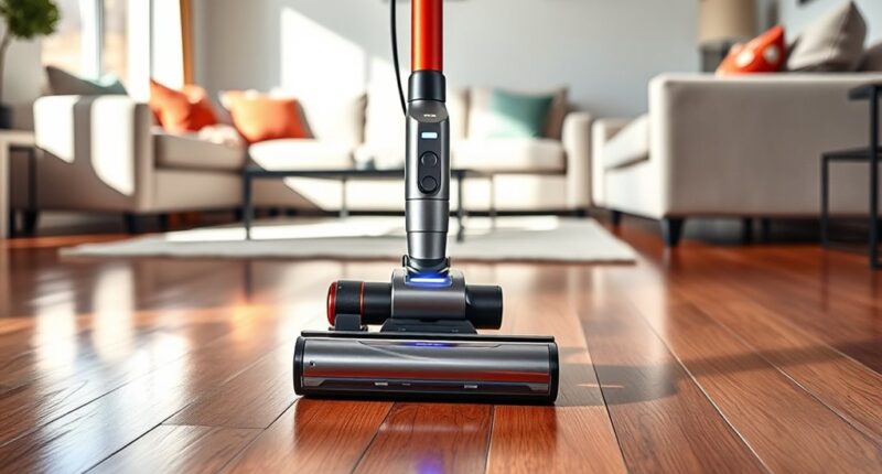 Ever wonder how suction power and modes impact your cleaning performance? Higher suction, measured in KPa or AW, typically means better cleaning, especially for pet hair and embedded dirt. Multiple modes give you control, letting you modify power for different surfaces—saving battery and preventing damage. Ultra-powerful models provide maximum suction but often have shorter runtimes, so it’s about finding the right balance for your needs. Adjustable modes are handy for delicate surfaces, ensuring you don’t cause scratches while still tackling stubborn debris. When choosing a cordless stick vacuum, consider the suction power ratings and modes to match your cleaning needs. The right combination ensures you get effective, efficient cleaning without sacrificing runtime or risking surface damage.
