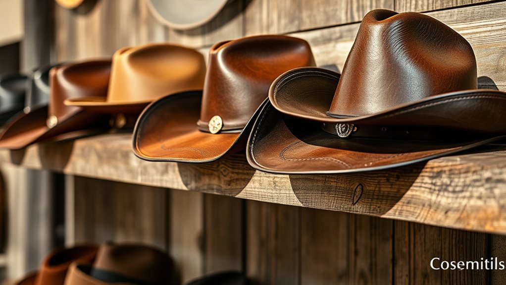 Choosing the right cowboy hat means considering both durability and comfort, as these factors directly impact how well the hat performs and feels during extended wear. Durable cowboy hats are made from high-quality materials like felt, straw, or reinforced plastics that resist wear and keep their shape over time. Comfort depends on weight, breathability, and fit—well-ventilated materials prevent overheating, especially outdoors. Soft, flexible fabrics like felt or woven straw offer a snug fit and ease of movement, making them comfortable for long hours. Striking a balance between sturdy construction and lightweight design ensures the hat can withstand regular use without causing discomfort. Ultimately, selecting a material that combines resilience and comfort helps you enjoy your cowboy hat in any setting.