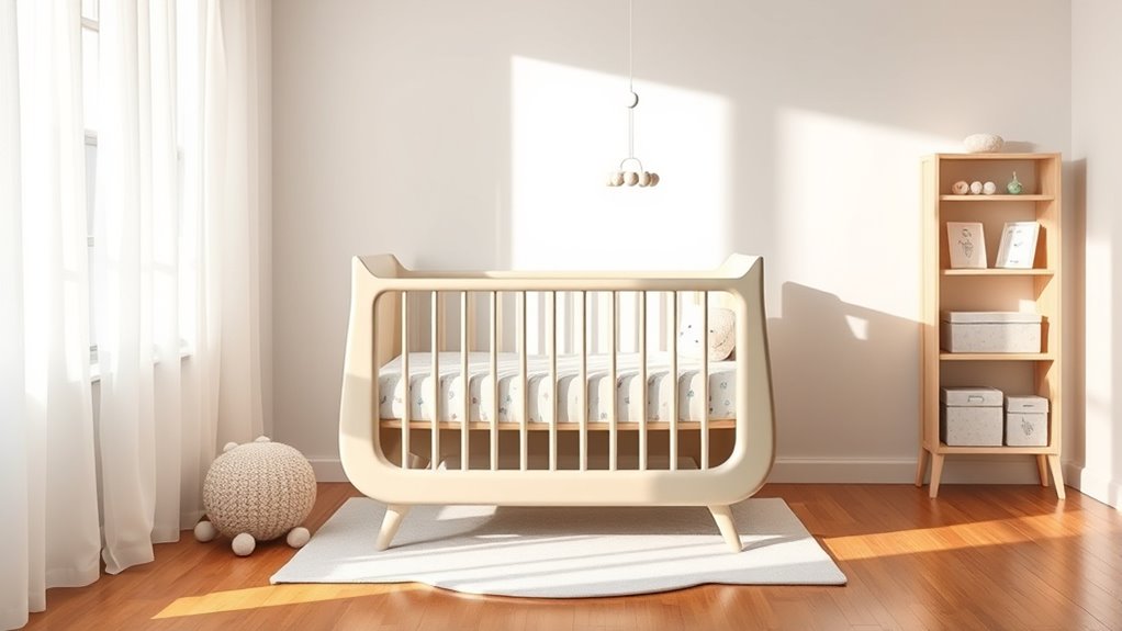 When designing a nursery, the crib’s appearance plays a vital role in creating a welcoming and harmonious space. I consider how the crib’s style complements the overall decor, whether it’s modern, vintage, or whimsical. The finish and color choices, like non-toxic paints or natural wood tones, not only enhance the look but also guarantee safety. Shape and detailing, such as slats, panels, and decorative features, add to the nursery’s visual harmony and ambiance. A gender-neutral design offers versatility, making it adaptable to various themes and future redecoration. Choosing a stylish yet timeless design means the crib will remain a beautiful centerpiece for years, blending aesthetics with longevity. Ultimately, the right design creates a cozy, cohesive environment for your little one.