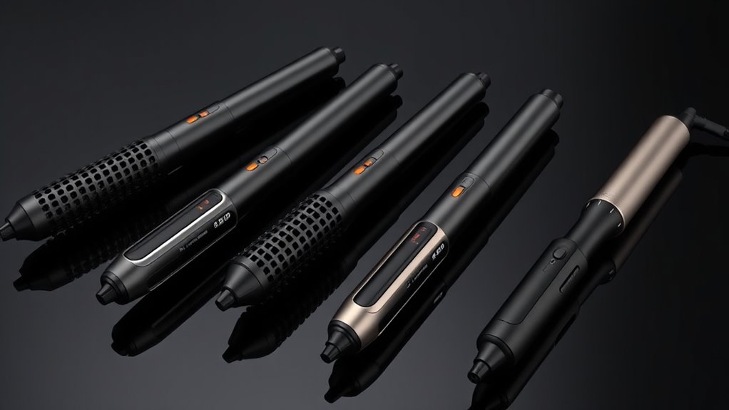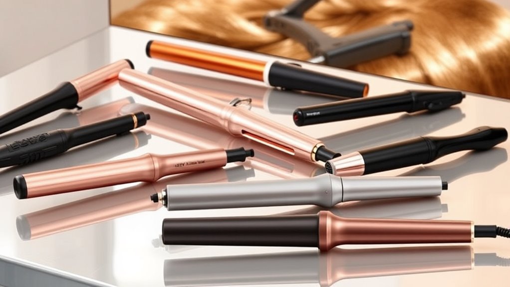 The material and coating of a curling iron’s barrel play a crucial role in how well it performs and how gentle it is on your hair. Ceramic barrels distribute heat evenly, reducing hot spots and minimizing damage and frizz. Tourmaline-coated barrels emit negative ions that neutralize static, boost shine, and help create healthier-looking curls. Titanium barrels heat up quickly and maintain consistent high temperatures, making them perfect for thick or stubborn hair. The choice of material also influences weight, heat retention, and safety features, affecting ease of use and hair health. When selecting a curling iron, consider these factors carefully—your hair type and styling goals will determine the best material and coating for achieving flawless waves with minimal damage.