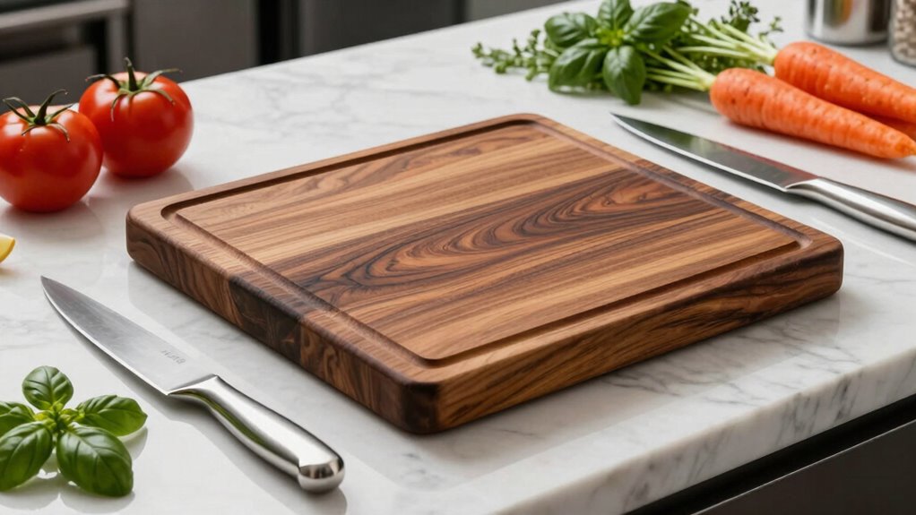When it comes to cleaning your cutting board, the material plays a crucial role in how easy it is to keep it sanitary. Non-porous surfaces like plastic and certain composites are much simpler to clean and sanitize thoroughly compared to porous woods or bamboo, which can trap bacteria. Dishwasher-safe boards make cleanup quick and effective, reducing manual scrubbing and lowering cross-contamination risks. Boards with juice wells or grooves help contain liquids and spills, making cleanup faster and keeping your workspace tidy. Smooth, flat surfaces without deep grooves or textured patterns are less likely to trap food particles or bacteria, simplifying the cleaning process. Additionally, materials resistant to staining and odors, such as high-quality plastics or treated bamboo, help maintain cleanliness and freshness over time.