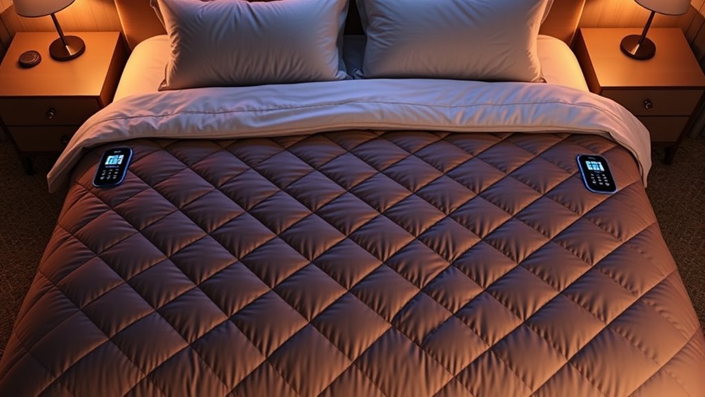 Choosing an electric blanket with adjustable heating levels is essential for personalized comfort, especially in a king-size model with dual controls. I look for models offering multiple settings, typically between 9 and 12, so I can fine-tune the warmth to my liking. Clear, easy-to-use controls, like LED or digital interfaces, make adjustments quick and precise. A wide temperature range, from about 83℉ to 113℉, ensures I can find the perfect level for any night. For shared beds, independent control of each zone is a big plus, allowing both partners to set their preferred warmth. Also, I prefer blankets that allow seamless adjustments without changing other settings, making it simple to customize my sleep environment effortlessly.