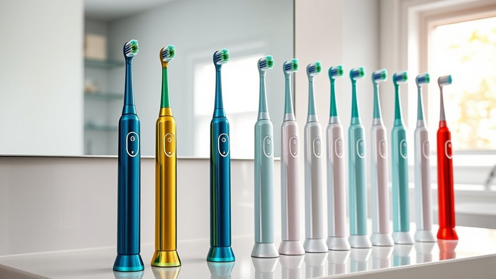 Choosing an electric toothbrush with the right brushing modes and settings is essential because it directly impacts your oral health and comfort. Multiple modes like Clean, White, Gum Care, and Sensitive let you customize your brushing routine to target specific needs. Adjustable intensity settings also give you control, allowing for gentle cleaning or more vigorous action depending on your preference. Many models include timers and pacers, such as 30-second quadrant alerts and two-minute durations, to ensure thorough brushing. Specialized modes can help with stain removal or gum massage for more effective oral care. When selecting a toothbrush, consider the variety and functionality of these modes to match your personal oral hygiene goals and sensitivities, making your brushing routine both effective and comfortable.
