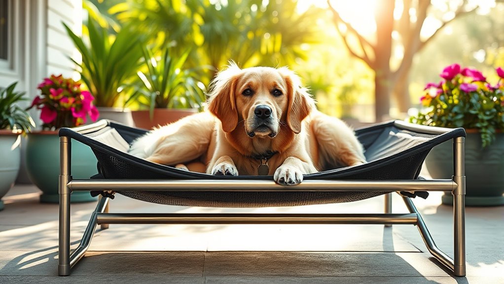 Selecting the right elevated dog bed depends heavily on where you’ll use it. Indoor beds often feature softer, stylish materials that blend with home decor, emphasizing comfort and support. They’re perfect for naps and relaxation inside, with cushioning designed for coziness. Outdoor beds, on the other hand, focus on durability, using weather-resistant fabrics and sturdy frames that handle sun, rain, and dirt. They should have non-slip, waterproof, and UV-resistant features to withstand outdoor conditions. While indoor beds prioritize comfort, outdoor beds emphasize airflow and resilience to prevent wear from environmental elements. Consider your dog’s typical environment and the bed’s resistance to moisture, UV rays, and rough conditions. Choosing appropriately guarantees your pup stays comfortable and the bed stays durable over time.