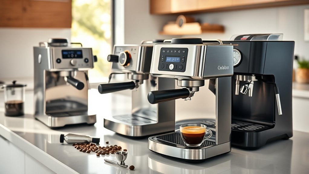 Ease of use is a vital factor that can make or break your home espresso experience. A machine with intuitive controls, like one-touch buttons or simple dials, helps beginners brew with confidence. Clear display screens and guided instructions make steering setup and customizing drinks straightforward. Fully automatic or semi-automatic models that handle water pressure, temperature, and extraction simplify operation, even for newcomers. Removable water tanks and easy-to-clean parts boost usability by reducing setup time and maintenance hassle. Machines with pre-programmed settings or adjustable features allow consistent results without extensive manual skill. Overall, choosing an espresso machine that’s simple to operate ensures you enjoy quality coffee without frustration, making your home brewing routine more enjoyable and accessible.