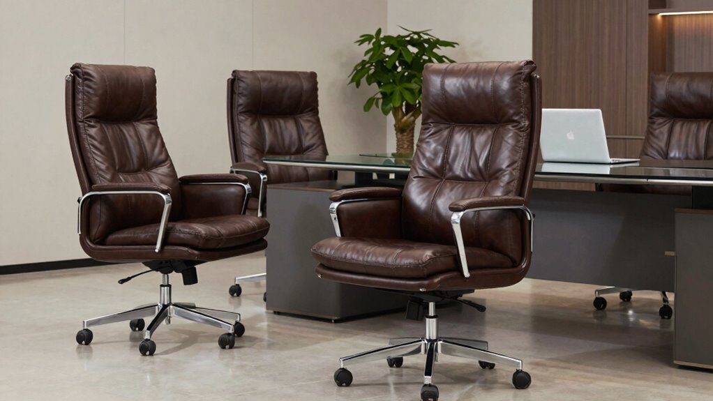 Adjustability options play a key role in customizing a leather executive office chair to fit your specific needs. An adjustable height mechanism is essential, letting you set the chair to your ideal ergonomic position and reducing strain on your neck and shoulders. Tilt and tilt tension controls allow you to personalize your recline angle and resistance, promoting comfort during both focused work and relaxation. Lumbar support adjustments, whether inflatable or manual, help maintain proper spinal alignment and reduce lower back discomfort. Armrest height and angle adjustments ensure proper support regardless of arm length or posture. Some chairs also feature multi-directional adjustments, like headrests and backrests, enhancing overall comfort and ergonomic versatility. These features guarantee your chair adapts perfectly to your body and work habits.