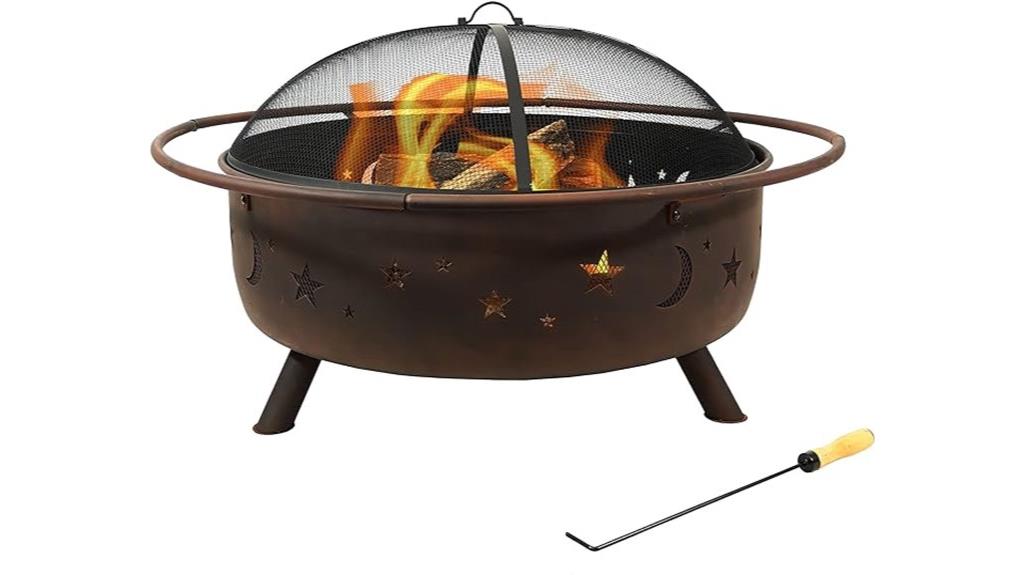Looking for a fire pit that combines size, style, and safety? The Sunnydaze Cosmic 42-Inch Outdoor Fire Pit might be just what you need. It’s a large, round, wood-burning fire pit perfect for outdoor gatherings with space for 8-10 people. Its contemporary design features rustic patina-colored alloy steel with star and moon cutouts, adding a charming touch. The fire bowl’s built-in grate, mesh spark screen, and airflow cutouts promote safe, efficient fires. Easy to assemble and maintain, it’s ideal for creating cozy backyard moments. Just remember to cover it when not in use to prevent rust, and enjoy those stunning outdoor nights!