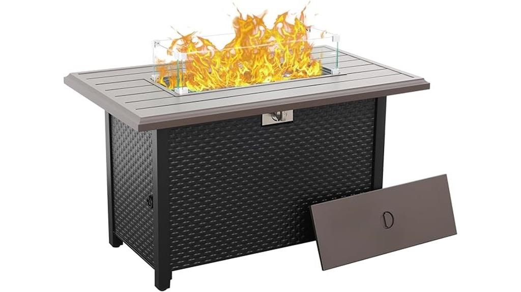 For those seeking a powerful and stylish outdoor fire feature, the Ciays 43-Inch Rectangular Propane Fire Pit with 60,000 BTU stands out as an excellent choice. It delivers ample heat, perfect for outdoor gatherings, thanks to its robust 60,000 BTU output. Made from durable alloy steel with a sleek black finish, it combines durability with modern design. The fire pit includes a stainless steel burner for consistent flames and adjustable control for the perfect ambiance. Its reflective glass stones add a contemporary touch, while the wind guard and extended tabletop enhance safety and functionality. At 43 inches long, it’s an attractive, reliable centerpiece for any patio or garden.