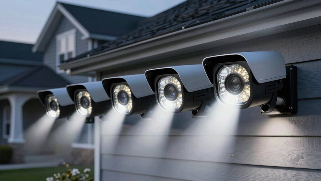 When selecting a floodlight security camera with 2K resolution, I focus on several key factors. I look at the video quality, lighting capabilities, detection features, storage options, and weather resistance to guarantee it meets my needs. These aspects help me choose a camera that’s reliable, clear, and durable in any situation.