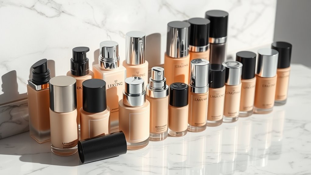 Have you ever wondered why your foundation doesn’t look or feel right? The key is matching it to your skin type. If you have oily skin, opt for formulas that control oil and give a matte finish—these help prevent shine throughout the day. For dry skin, choose hydrating foundations with a dewy look to keep your skin feeling comfortable and plump. Sensitive skin benefits most from non-comedogenic, fragrance-free, and hypoallergenic options that minimize irritation and breakouts. It’s also important to contemplate your skin’s current condition—testing shades in natural light and understanding your oil production, hydration levels, and sensitivity can save you from mismatches and adverse reactions. The right foundation, tailored to your skin type, makes all the difference in achieving a flawless, natural look.