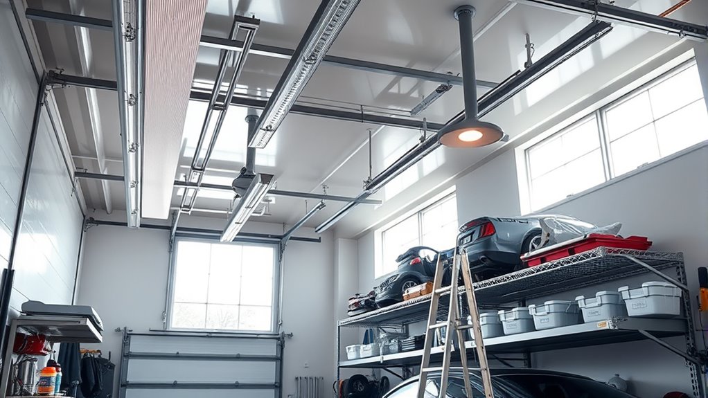 Maximizing your garage space is essential, and overhead storage systems are a smart way to do it. They utilize ceiling space, freeing up valuable floor and wall areas, which makes your garage feel more open and functional. These systems can support hundreds of pounds per rack, substantially boosting your storage capacity and helping you reduce clutter. With adjustable heights, you can customize the setup to fit ceiling heights and specific items, ensuring easy access and most effective use of space. Ceiling-mounted racks are perfect for seasonal or rarely used items, keeping them out of the way but still accessible. Properly installed overhead storage creates a more spacious environment, making it easier to move around, work, and maintain an organized garage.