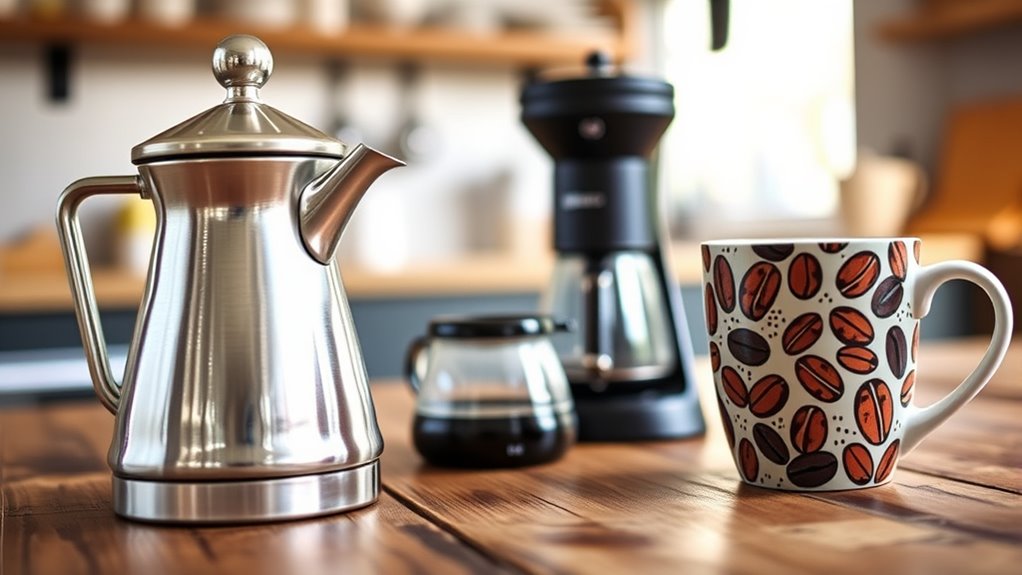 Indeed, many of these gifts are perfect for outdoor adventures or travel. I’ve found that portable coffee makers, insulated travel mugs, and compact pour-over sets are especially handy for brewing on the go. They’re designed to withstand the rigors of a day’s journey, much like a trusty steed of yore. So, whether camping or commuting, these gifts guarantee your coffee-loving friend can enjoy a fresh brew anywhere.
