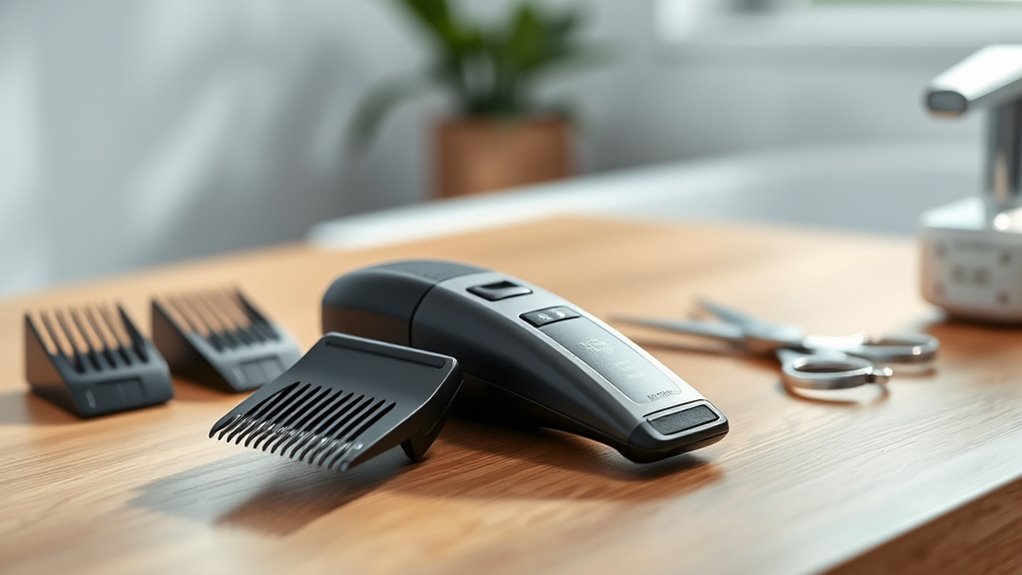 When choosing grooming clippers, safety features are key. I look for models with a close-to-skin guard to prevent cuts, and a safety lock to avoid accidental activation. An ergonomic design helps me maintain control, reducing mishaps. I also prefer clippers with quiet motors, so my pet isn’t stressed. Checking for easy blade removal and cleaning guarantees hygiene. Prioritizing these features keeps grooming safe and stress-free for both of us.