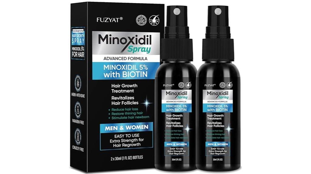 The Minoxidil Hair Growth Spray 2PCS is an excellent choice for anyone seeking an easy, mess-free solution to combat hair thinning and promote fuller growth. Its 5% Minoxidil formula, combined with biotin, revitalizes hair follicles and nourishes the scalp, encouraging faster regrowth. The spray design makes application simple—just 1ml twice daily directly onto affected areas—without mess or greasy residue. Users often notice thicker hair, reduced fall, and improved texture within weeks. Plus, it’s versatile enough for scalp, beard, and eyebrows. The compact bottles are perfect for travel, and with consistent use, you’ll see sustained results over time, making it a practical addition to your hair care routine.