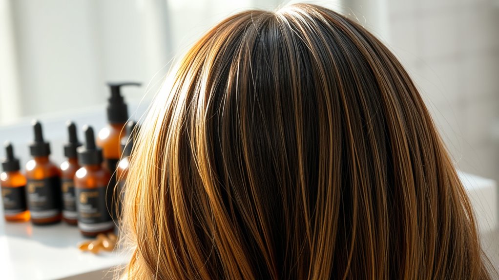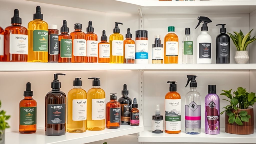 Understanding your hair type is essential for picking the right hair growth treatment, as different textures respond better to specific formulations. For example, straight or fine hair often benefits from lightweight serums or quick-absorbing treatments that won’t weigh it down or flatten it. Conversely, coarse or curly hair needs richer oils or creams that deeply hydrate and strengthen, promoting elasticity. If you have a sensitive scalp, opt for gentle, chemical-free options designed for delicate skin to prevent irritation. Knowing your hair’s porosity and density can further refine your choice, ensuring the treatment nourishes effectively without buildup or irritation. Tailoring your approach based on your hair type helps maximize results and keeps your scalp healthy as you work toward growth.