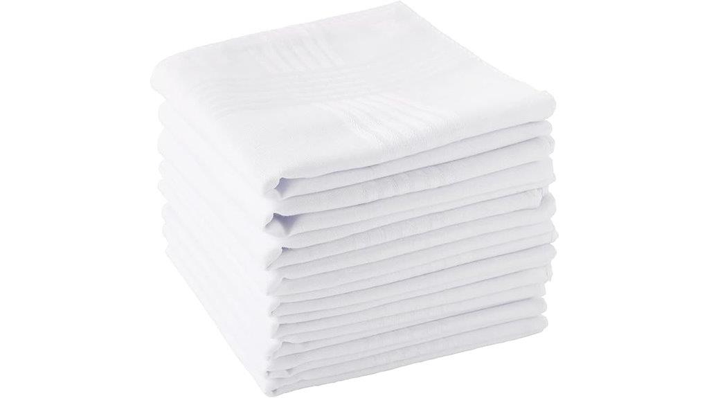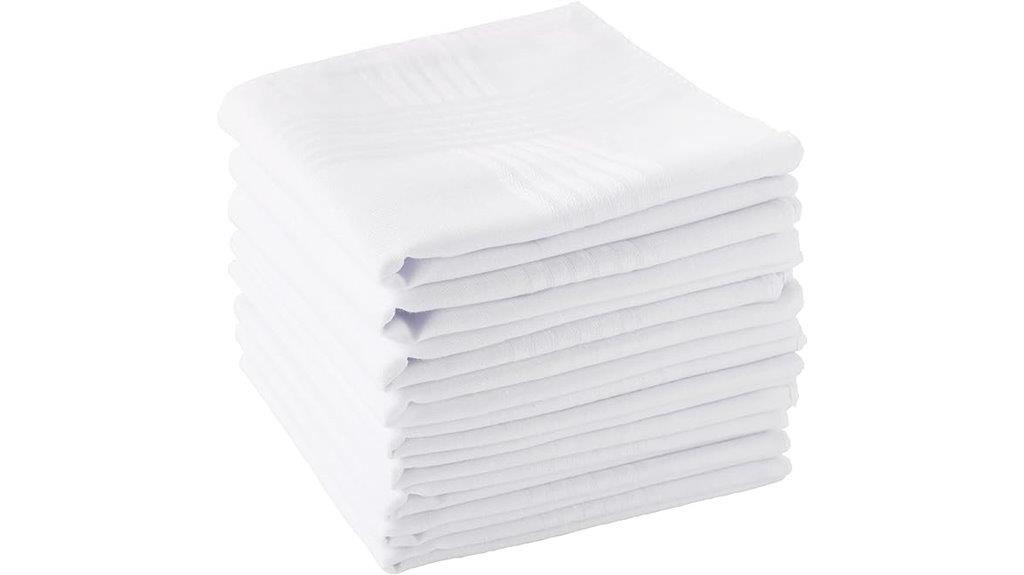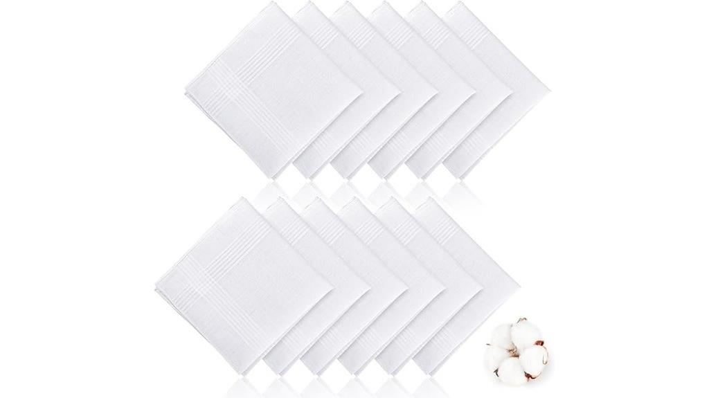 - Pack of 12 versatile white handkerchiefs suitable for various uses and occasions.