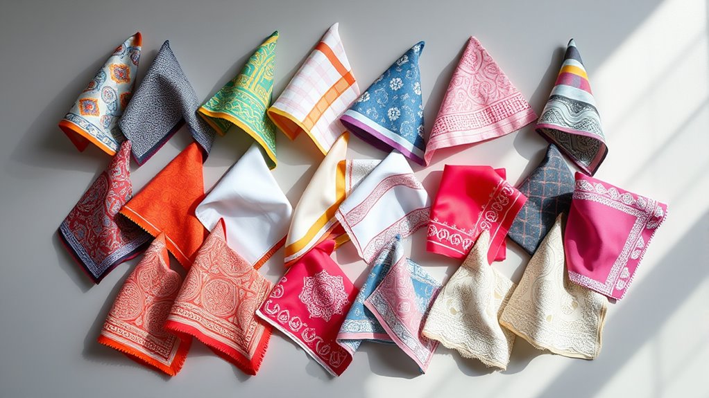 To make your high-quality handkerchiefs last, I recommend gentle washing in cold water and avoiding harsh detergents. I always air dry mine to prevent fabric damage, and I iron them on a low setting if needed. Keep them away from bleach and rough surfaces, and store them flat to maintain their shape. Regular care like this keeps my handkerchiefs looking fresh and extends their lifespan.