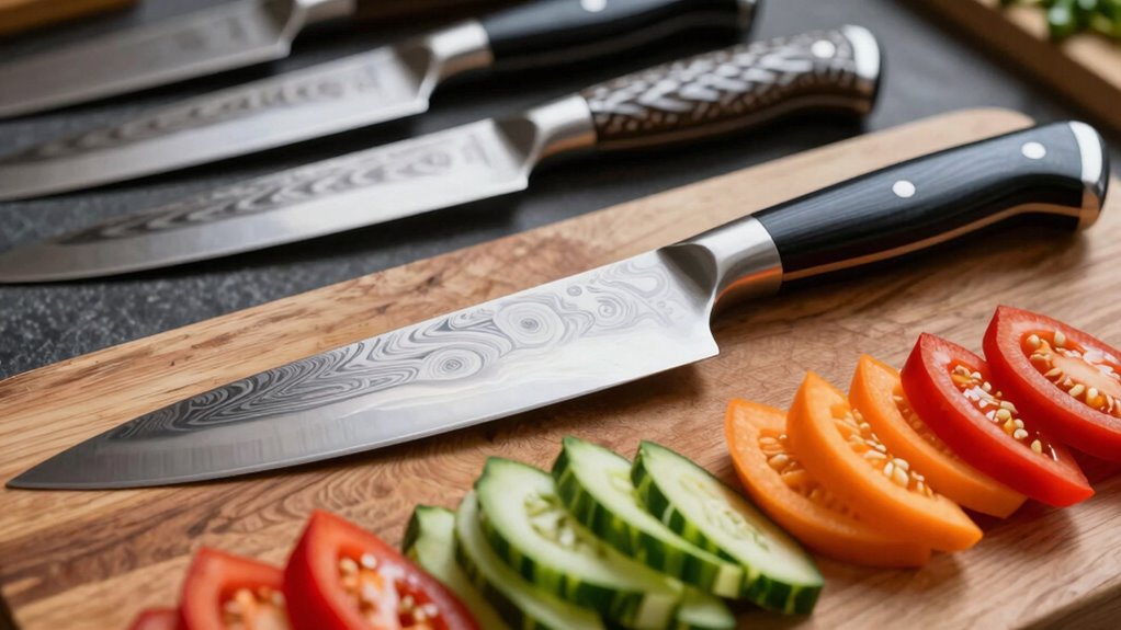 Choosing the right blade material is essential because it directly affects a knife’s sharpness, durability, and ease of maintenance. High-quality handmade Japanese knives often use steels like VG-10, 9CR18MOV, Blue Steel #2, or Damascus steel, which are known for their exceptional hardness, edge retention, and corrosion resistance. The layering technique, such as Damascus or multi-layered steel, not only boosts durability and flexibility but also creates striking patterns. The steel’s carbon content is vital—it determines how sharp the edge can get and how long it lasts. Higher carbon steels hold an edge longer but need proper care to prevent rust. Proper heat treatment, including quenching and cryogenic tempering, optimizes hardness and toughness, ensuring the knife performs well across various kitchen tasks.