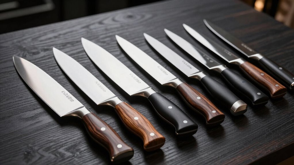 When selecting a premium chef knife, craftsmanship and design play a pivotal role in facilitating both performance and aesthetic appeal. I look for knives that showcase meticulous hand-forging, which creates unique patterns and textures, signaling superior craftsmanship. The handle’s ergonomic shape, made from high-quality materials like pakkawood or featuring mosaic pins, markedly improves comfort and control. Visually, I appreciate Damascus patterns, layered steels, and polished finishes that give the knife a striking appearance. Precise blade angles—around 16° or 12–14°—are essential for sharpness and ease of slicing, while full tang construction, secure rivets, and seamless transitions between handle and blade guarantee durability and balance. These details combine to deliver a tool that’s as beautiful as it is functional.