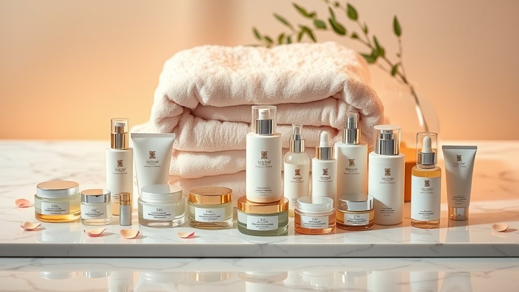When choosing luxury skincare sets, I look for key ingredients like hyaluronic acid for deep hydration, antioxidants such as vitamin C to brighten skin, and peptides to boost firmness. I also prefer sets with natural oils like argan or jojoba, plus gentle exfoliants like alpha hydroxy acids. These ingredients work together to nourish, protect, and rejuvenate my skin, making the products feel truly luxurious and effective.