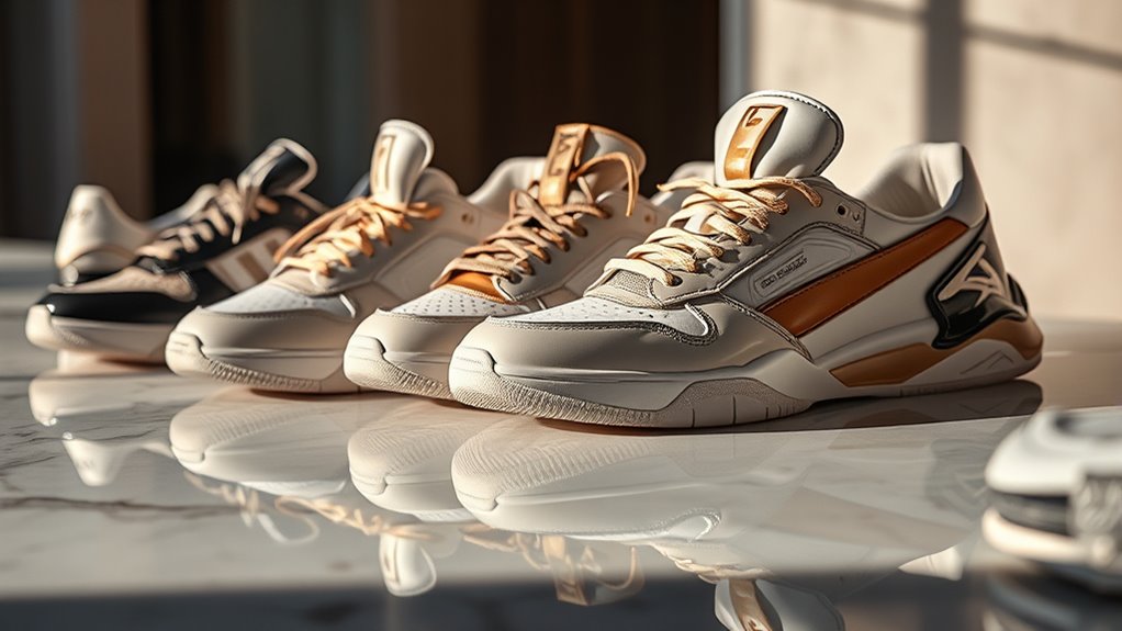 Choosing high-end sneakers hinges on the quality of materials and craftsmanship, as these factors directly influence their durability, comfort, and overall appearance. Premium materials like genuine leather, high-quality suede, and durable technical fabrics not only elevate the look but also guarantee longevity. Superior craftsmanship involves precise stitching, seamless construction, and meticulous attention to detail, resulting in a refined finish that withstands regular wear. Many top brands prioritize sustainable sourcing, adding an eco-conscious edge without sacrificing quality. Reinforced areas and sturdy soles improve support and durability, while expert finishing touches contribute to a polished look. Authentic high-end sneakers undergo rigorous quality control, maintaining consistent standards of comfort, durability, and luxury across every pair I consider.