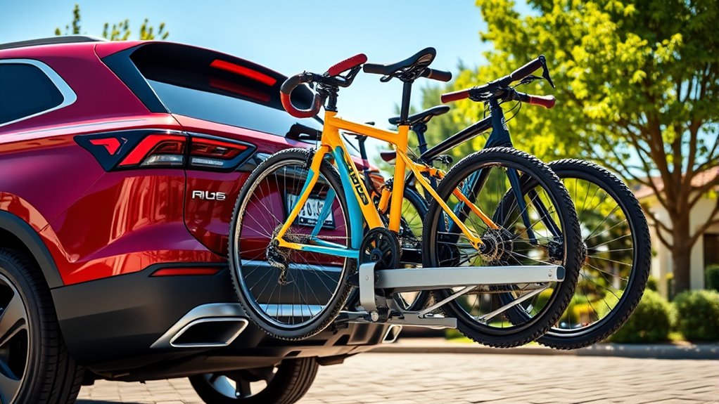 Ease of loading and unloading bikes is a key factor that can make your overall experience much smoother. I recommend choosing a hitch rack with a tilt or fold-down feature, so you can access your trunk without removing bikes. Low-loading height racks or those with ramps substantially cut down on effort, especially with heavier bikes. Quick-release or adjustable arms simplify securing and releasing bikes, saving time and reducing strain. Padded contact points prevent scratches and make loading gentler on your bikes. Additionally, clear, straightforward attachment mechanisms and minimal assembly requirements streamline the process. These features collectively ensure that loading and unloading become quick, easy tasks rather than frustrating hurdles, making your trips safer and more enjoyable from start to finish.