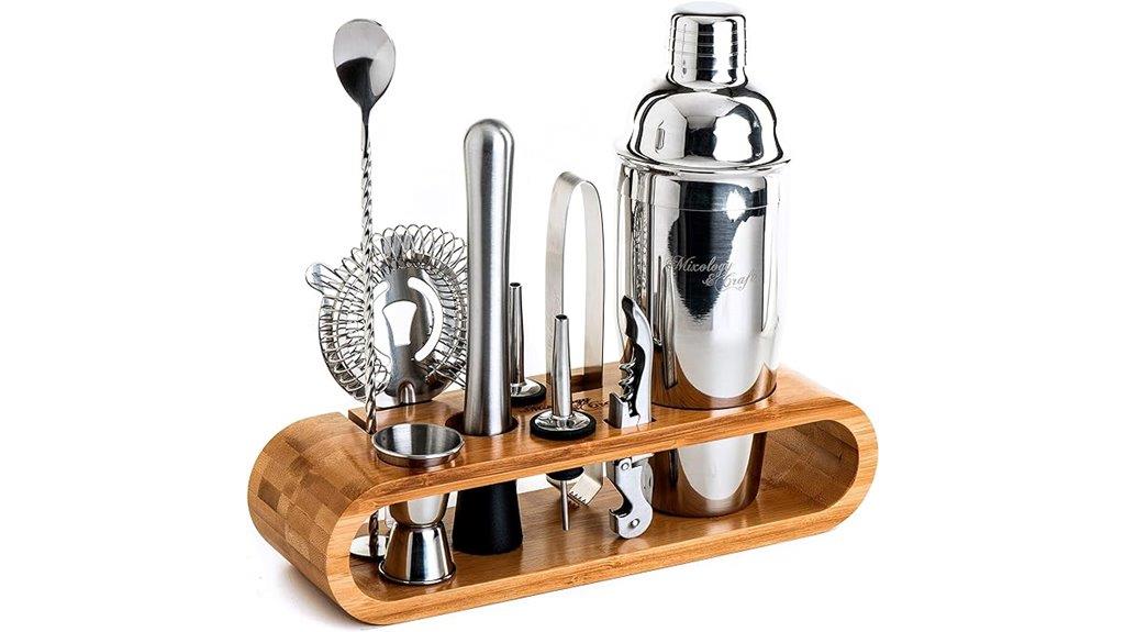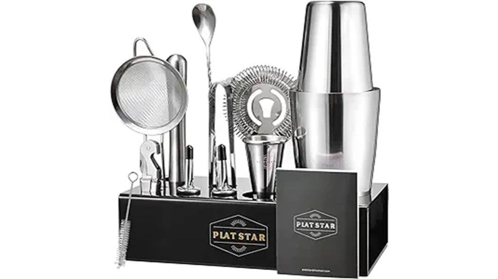 Best For: home bartenders and professional mixologists seeking a comprehensive, stylish, and durable cocktail shaker set with organization stand.