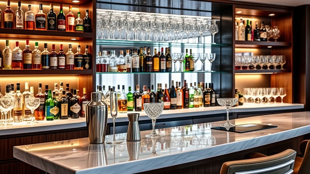 A well-organized home bar set features a sturdy stand or storage container that keeps tools neatly arranged and easy to access. Compact storage options like multi-tier shelves or designated compartments help maximize space and prevent clutter on your countertops. Using clear labels or color-coded sections allows for quick identification and retrieval of specific tools, saving you time when mixing drinks. Modular or stackable components give you the flexibility to customize storage arrangements to fit your space and needs. Additionally, choosing easy-to-clean storage solutions, such as stainless steel or sealed containers, helps maintain hygiene and prolongs the lifespan of your bar tools. Prioritizing smart storage ensures your home bar remains functional, tidy, and ready for entertaining at a moment’s notice.