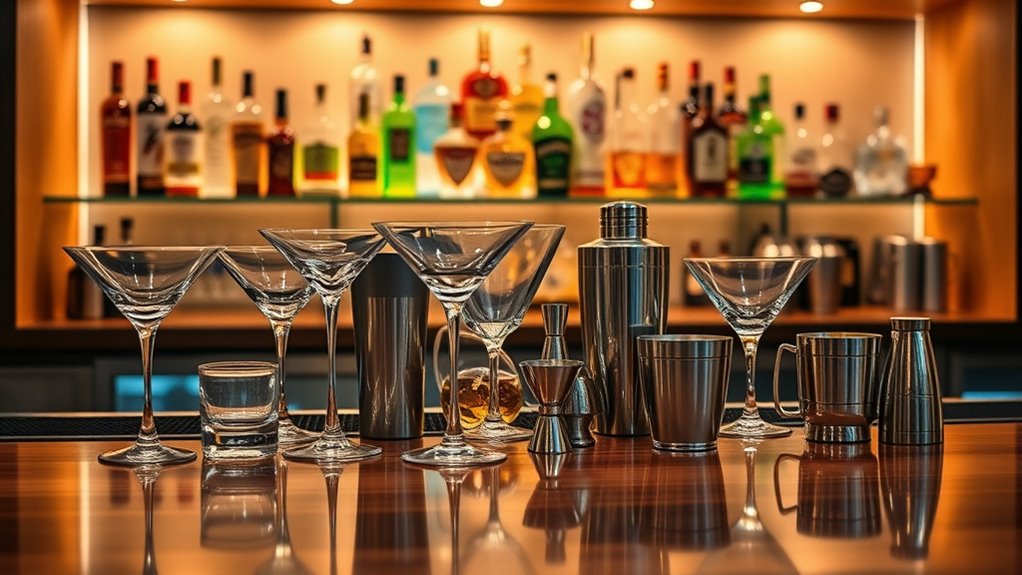 Looking to upgrade your home bar? I’ve found that the best sets combine quality stainless steel tools, stylish organization stands, and a variety of accessories like shakers, strainers, and recipe booklets. From sleek modern designs to rustic wood finishes, there’s a set to match your style. Whether you’re just starting out or a seasoned mixologist, these options add elegance and functionality. Keep exploring, and you’ll discover more tips to create a perfect entertaining setup.