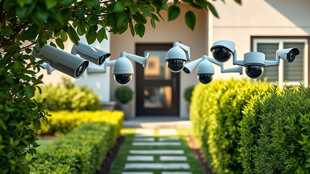 Outdoor cameras often have adjustable field-of-view angles, allowing me to customize what I see. Some models feature motorized pan-and-tilt capabilities, giving me the flexibility to cover wide areas or zoom in on specific spots. Others have fixed lenses, but I can select different camera models with wider or narrower views depending on my needs. This flexibility helps me optimize security coverage and make certain I don’t miss important details around my property.