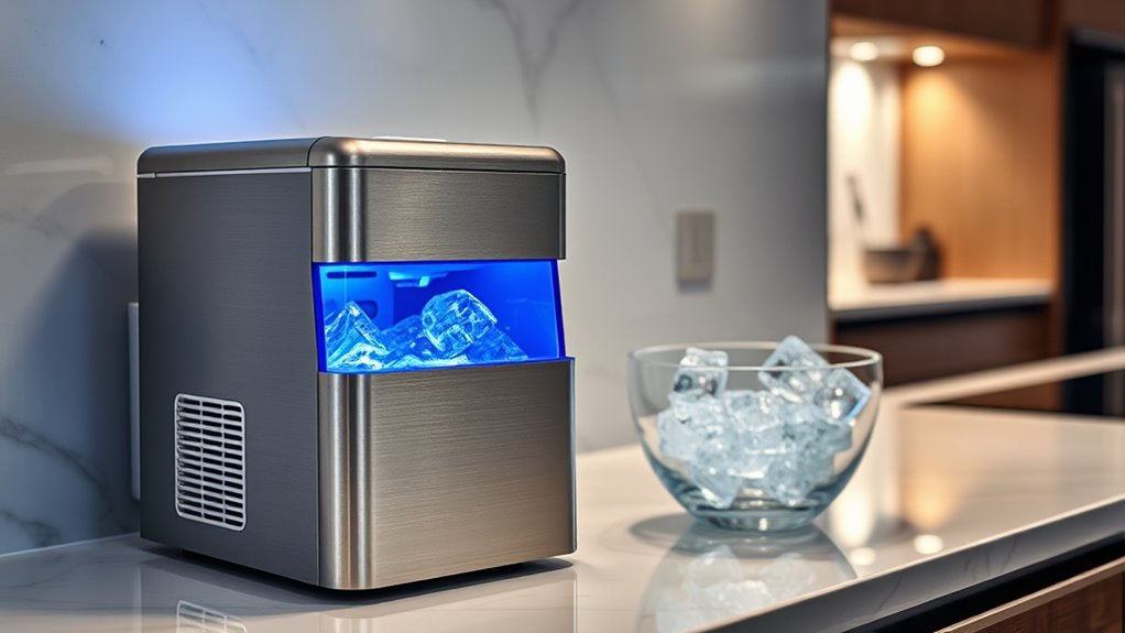 Choosing the right countertop nugget ice maker depends largely on its capacity and size, which directly affect how well it fits your needs. Capacity determines how much ice it can produce daily, ranging from about 33 to 55 pounds, ideal for different usage levels. Larger models provide continuous ice, perfect for parties or frequent use, but they also require more water and power. Conversely, compact units are great for small spaces, personal use, or small households, though they produce less ice per cycle. Size and footprint are vital—make sure the unit fits comfortably on your countertop without clutter. Additionally, the size of the storage bin influences how often you need to refill or empty it, impacting convenience during busy times.