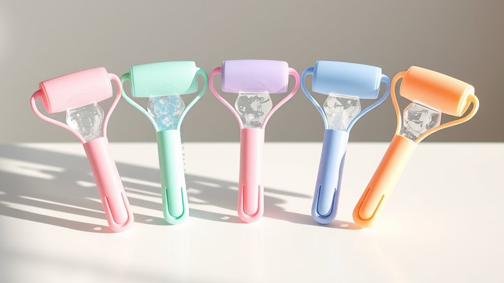 When choosing an ice roller, considering its versatility and refill options can substantially enhance your skincare routine. Refillable models let me customize treatments with ingredients like herbal infusions or whitening solutions, targeting specific skin concerns. Using reusable molds for ice cubes makes the device more cost-effective and eco-friendly, reducing waste from disposable options. Creating fresh ice daily ensures maximum hygiene and prevents bacterial buildup, keeping my skin safe. I can also experiment with recipes like green tea or cucumber water to soothe inflammation or reduce swelling. Refill options allow me to adapt my skincare over time, matching changing skin needs and preferences without needing a new device. This flexibility keeps my routine fresh, effective, and environmentally conscious.