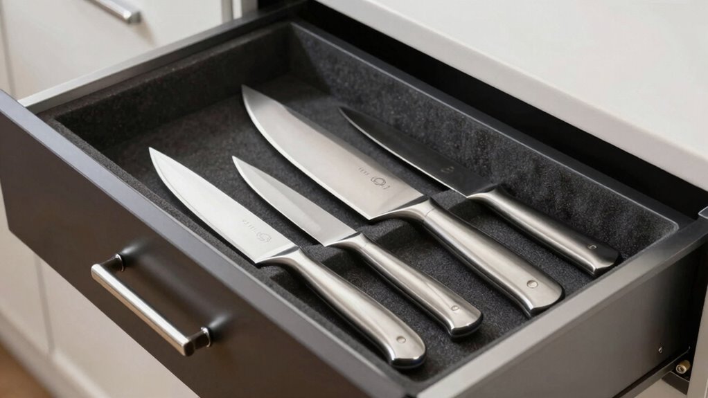 In-drawer knife organizers prevent blade dulling by providing individual slots that keep each knife separated, reducing friction and contact with other blades. This careful separation minimizes nicks and scratches that dull blades over time. Additionally, many organizers are lined with soft or non-abrasive materials, which cushion the blades and prevent unnecessary wear. I’ve found that using these organizers really helps maintain my knives’ sharpness longer.