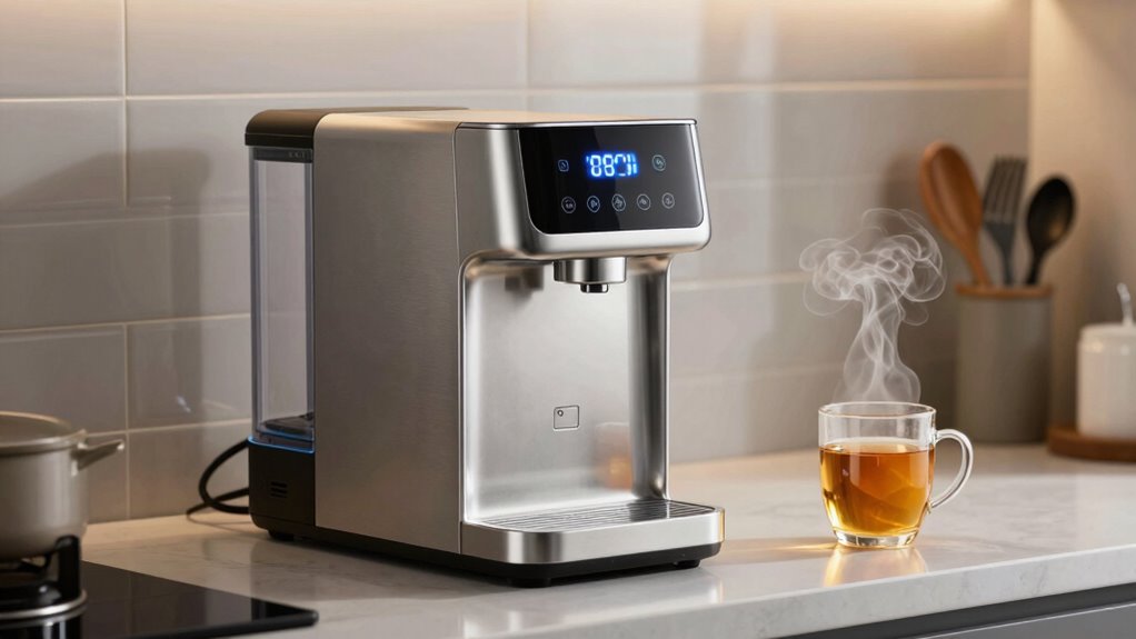 Accurate temperature control is vital because it guarantees you get the right hot water temperature for different tasks, from brewing tea to sanitizing dishes. Many systems allow you to set water within a specific range, typically from 140°F to over 200°F, providing versatility. Digital or manual thermostats enable precise adjustments, so you can tailor the temperature for each use. Some dispensers offer temperature presets or one-touch controls, making it quick to access your preferred settings. Consistent regulation helps prevent scalding, which is essential in households with children. Advanced models even feature real-time temperature monitoring and displays, giving you clear feedback on water temperature at any moment. This level of control ensures safety, efficiency, and ideal results for all your hot water needs.