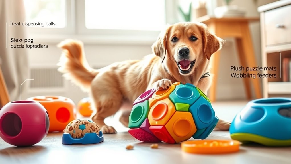 When boredom strikes, interactive dog puzzle toys offer a smart solution that keeps pets mentally engaged and entertained. Made from durable, dog-safe materials like ABS, nylon, and rubber, these toys withstand regular play while reducing noise, especially for larger breeds. They feature adjustable food-release mechanisms, encouraging slow eating and extending feeding time. Dogs learn to solve puzzles by rolling or manipulating the toy to access treats, boosting their IQ and reducing anxiety. Easy to disassemble for cleaning, these toys promote positive behavior by diverting attention from destructive habits. Overall, they provide a stimulating challenge that keeps your pup happy, busy, and mentally sharp.
