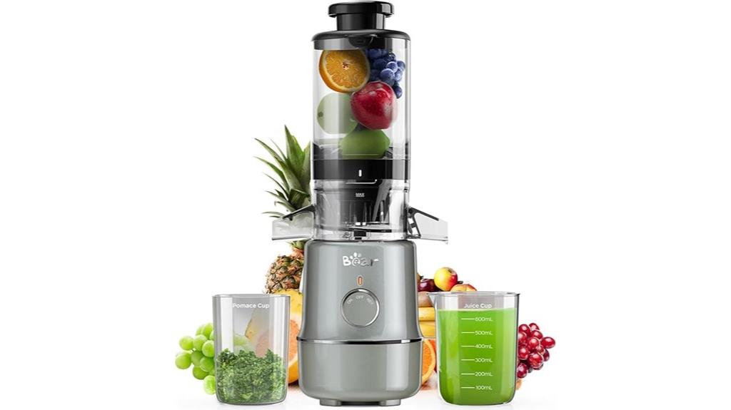 - Hands-free operation with hopper fitting whole produce for convenient juicing